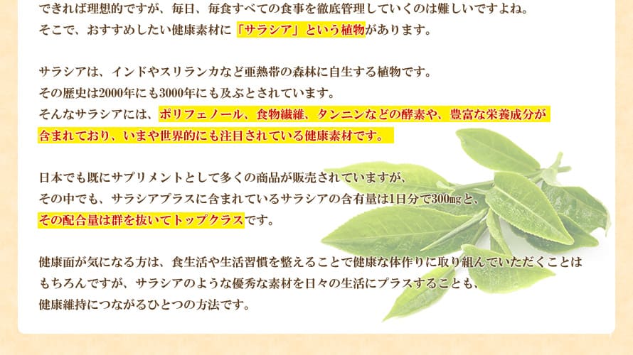 サラシアプラスは、健康食品ですので、特別指定はありませんが、食前に水などでお飲みいただくようおすすめしています。