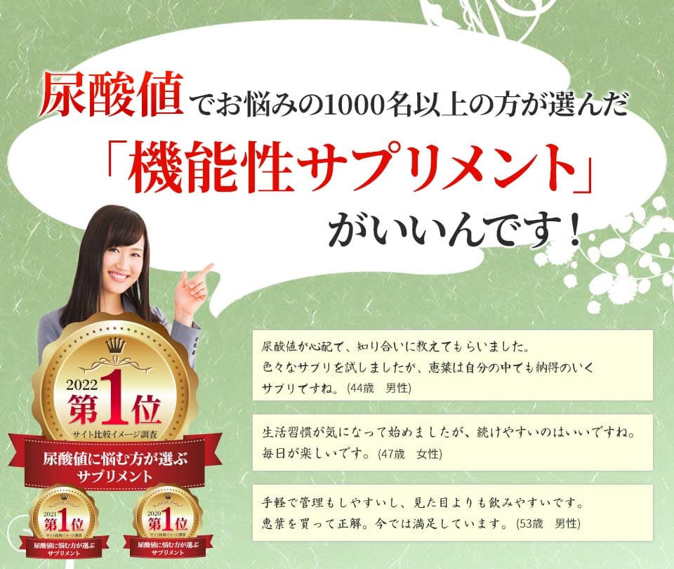 | 届出表示 : | 本品にはアンセリンが含まれます。アンセリンには血清尿酸値が高め(尿酸値5.5~7.0mg/dL)の方の尿酸値を下げる機能が報告されています。 ※本品は、事業者の責任において特定の保健の目的が期待できる旨を表示するものとして、消費者庁長官に届出されたものです。ただし、特定保健用食品と異なり、消費者庁長官による個別審査を受けたものではありません。 |