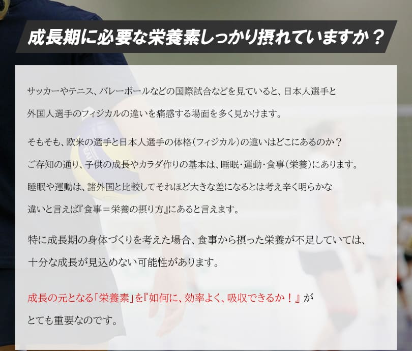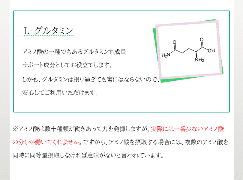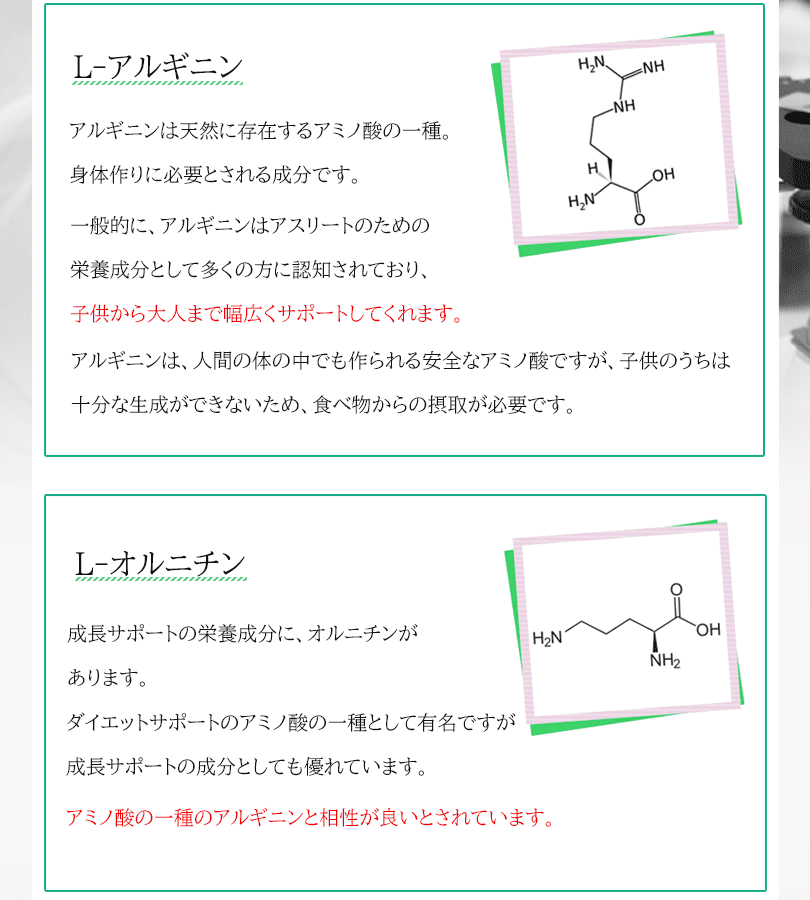 | 原材料 | ドロマイト(国内製造)、還元麦芽糖水あめ粉末、麦芽糖、スピルリナ原末、亜鉛含有酵母、卵黄ペプチド(卵を含む)、ホスファチジルセリン含有リン脂質末(大豆を含む)/粉末セルロース、L-アルギニン、ビタミンC、L-ヒスチジン、L-オルニチン塩酸塩、L-トリプトファン、L-フェニルアラニン、L-リジン塩酸塩、L-メチオニン、L-アスパラギン酸ナトリウム、L-グルタミン酸、L-グルタミン、L-プロリン、L-チロシン、ステアリン酸カルシウム、微粒二酸化ケイ素、ピロリン酸第二鉄、L-シスチン、L-ロイシン、ヒドロキシプロピルセルロース、ビタミンE、L-バリン、L-イソロイシン、ビタミンA、セラック、ビタミンD、ビタミンB1、ビタミンB2、ビタミンB6、ビタミンB12、L-スレオニン |