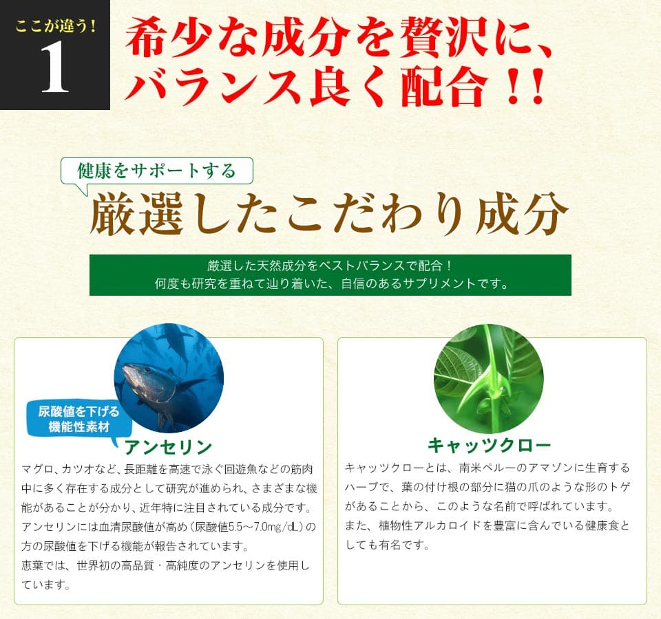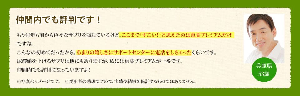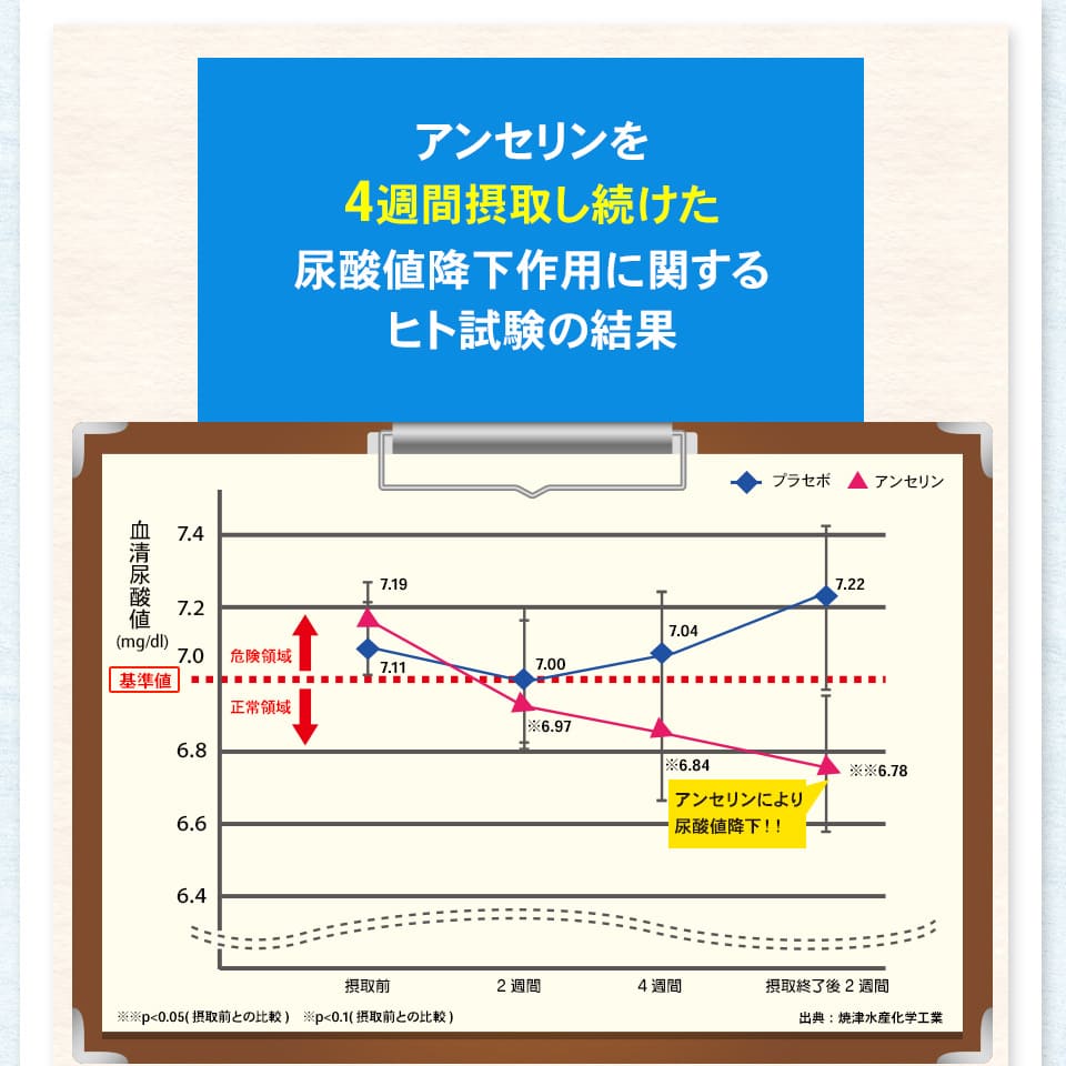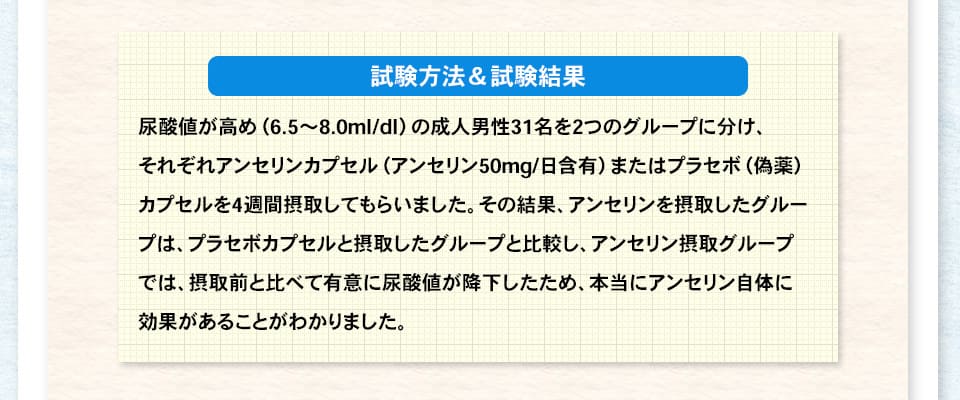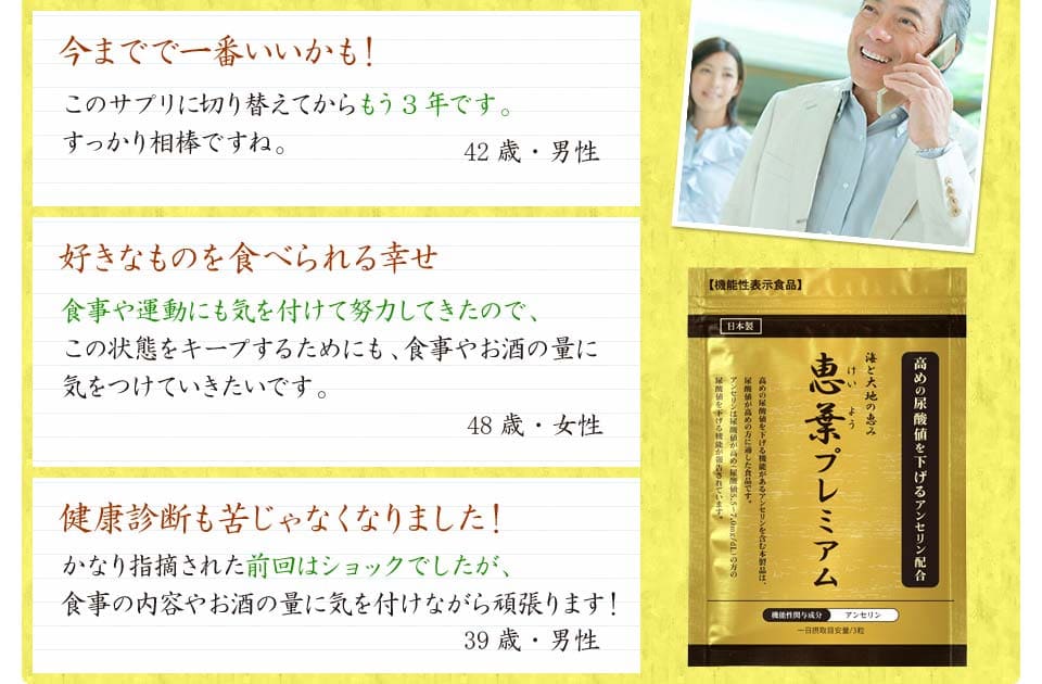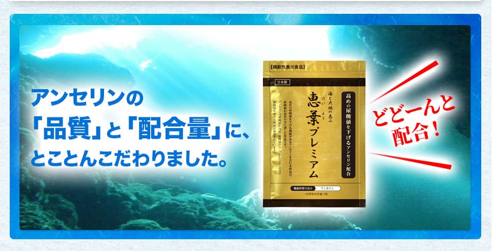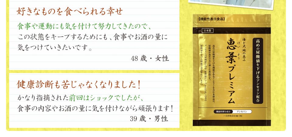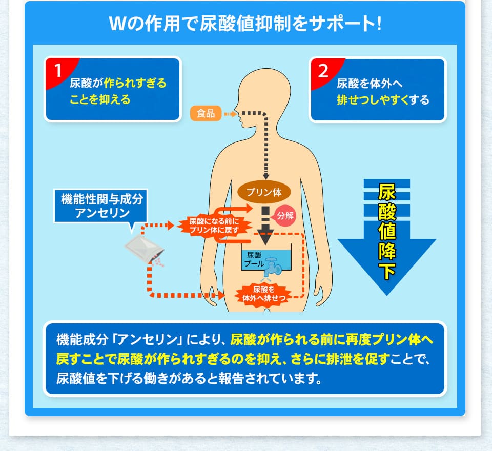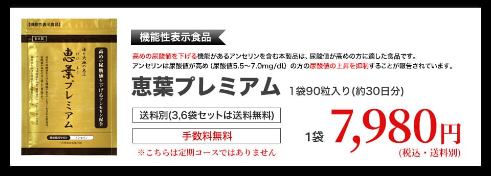 | 届出表示 : | 本品にはアンセリンが含まれます。アンセリンには血清尿酸値が高め(尿酸値5.5~7.0mg/dL)の方の尿酸値を下げる機能が報告されています。 ※本品は、事業者の責任において特定の保健の目的が期待できる旨を表示するものとして、消費者庁長官に届出されたものです。ただし、特定保健用食品と異なり、消費者庁長官による個別審査を受けたものではありません。 |