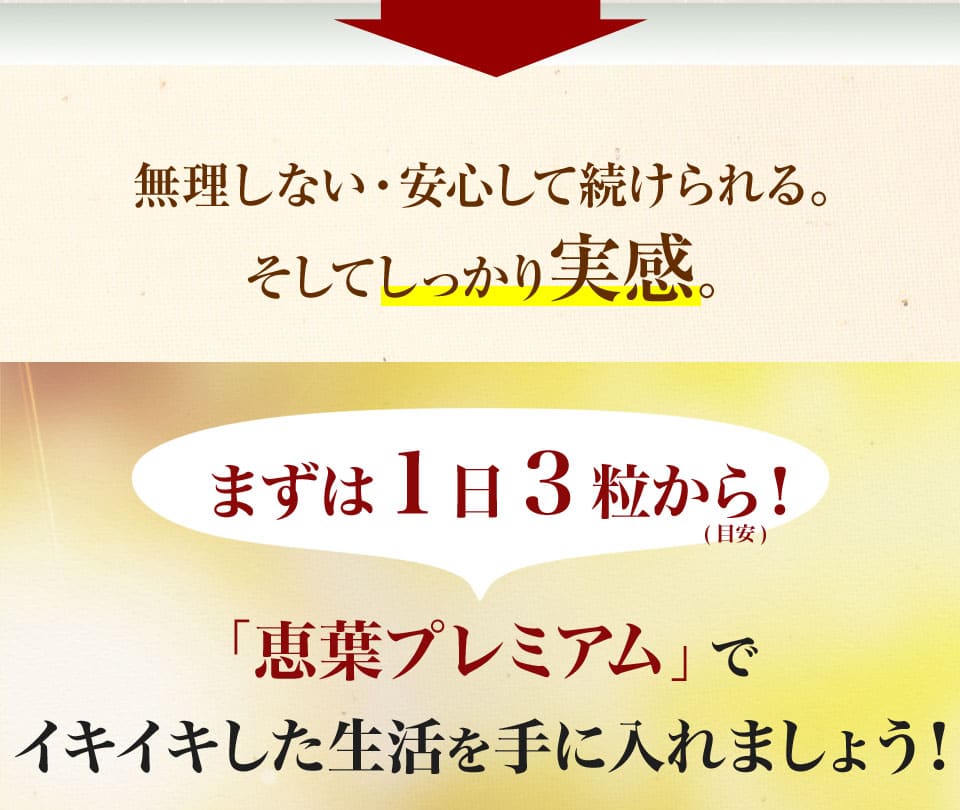 | お召し上がり方 : | 1日3粒を目安に水またはぬるま湯などと一緒にお召し上がりください。 |