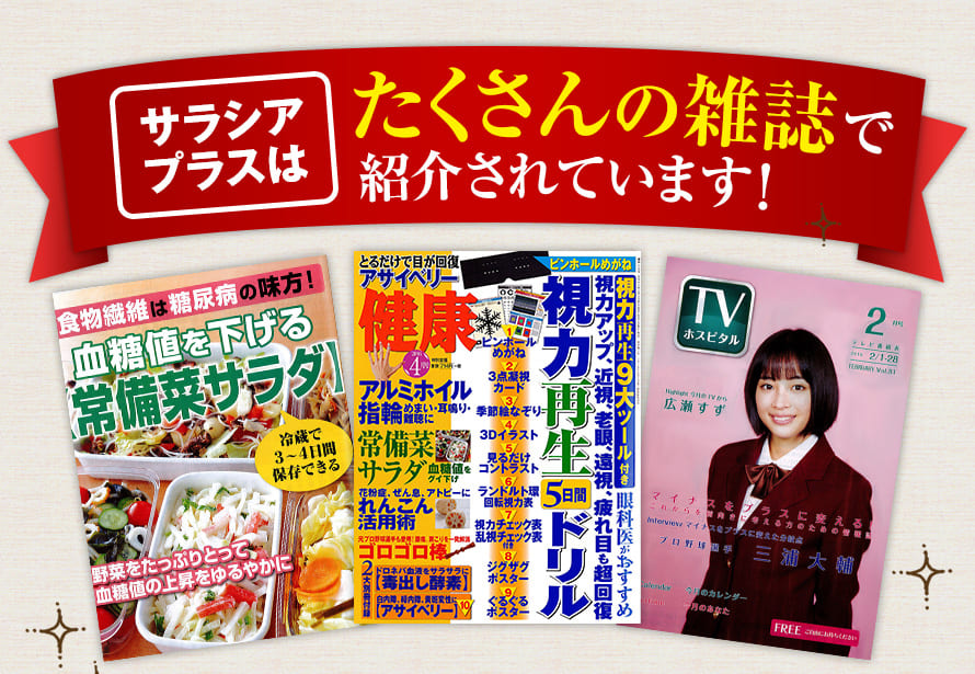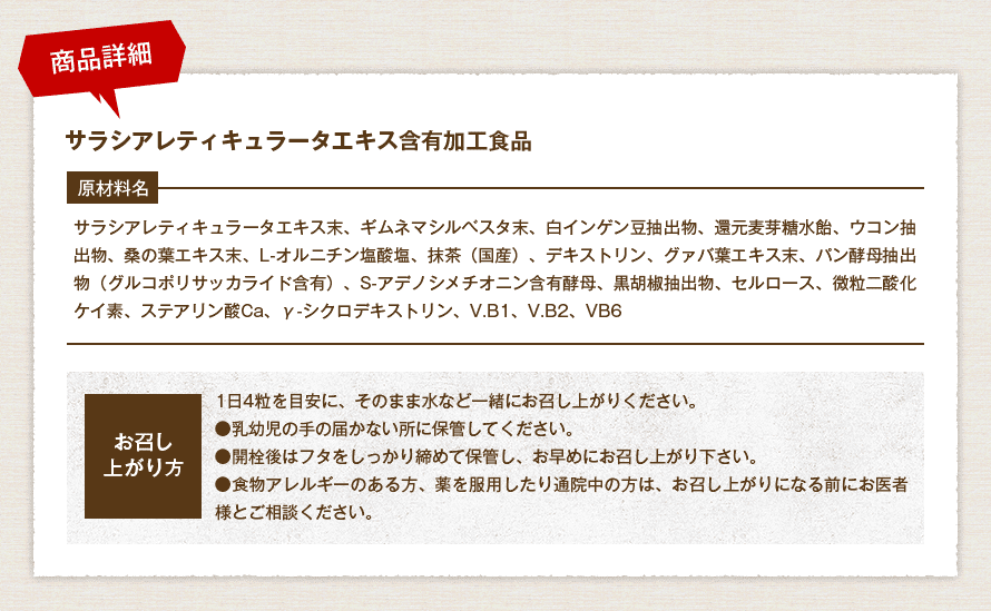 サラシアプラスは、健康食品ですので、特別指定はありませんが、食前に水などでお飲みいただくようおすすめしています。