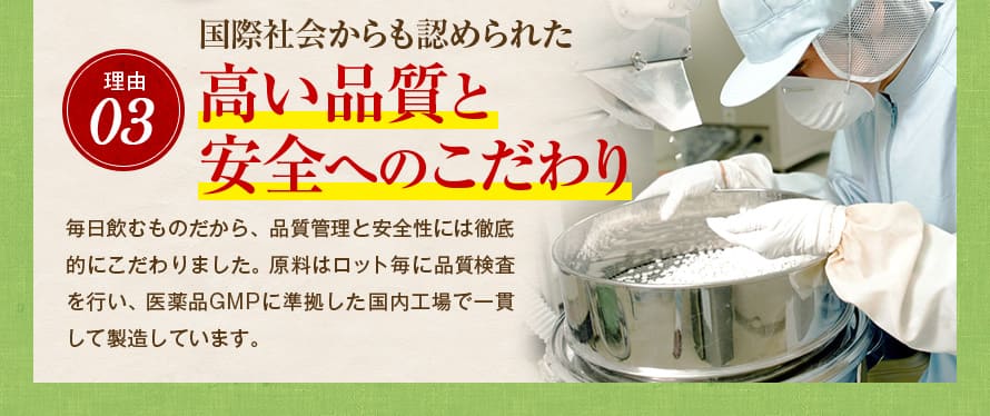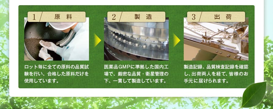 厚生労働省のガイドラインに基づき厳しい製造基準(GMP)をクリアした国内の提携工場で製造しています。ご安心ください。